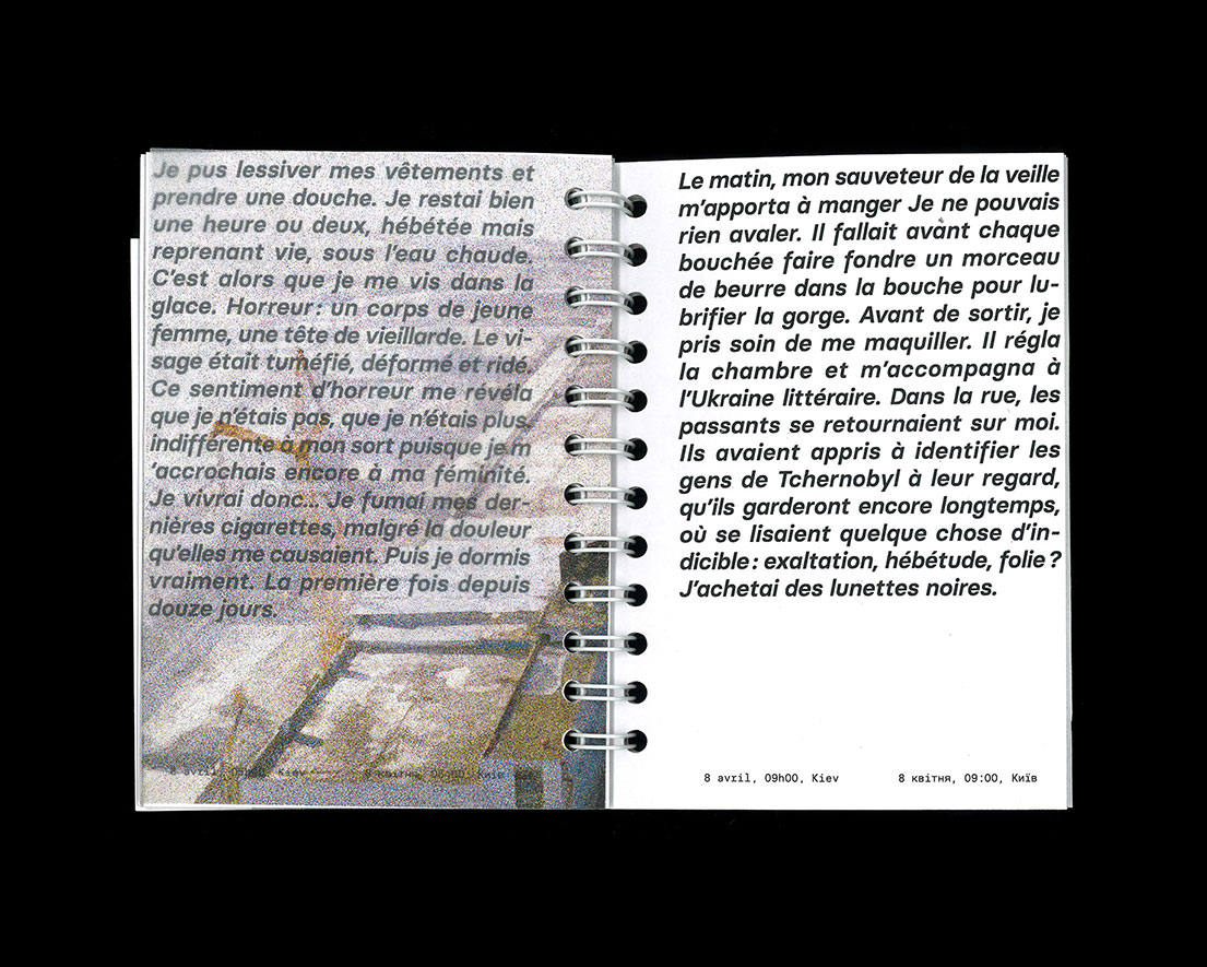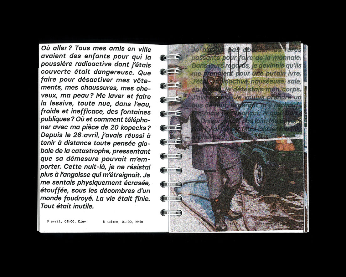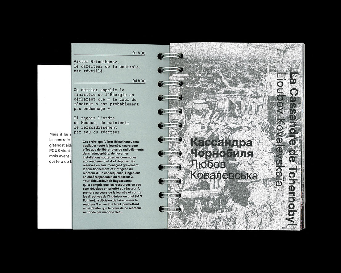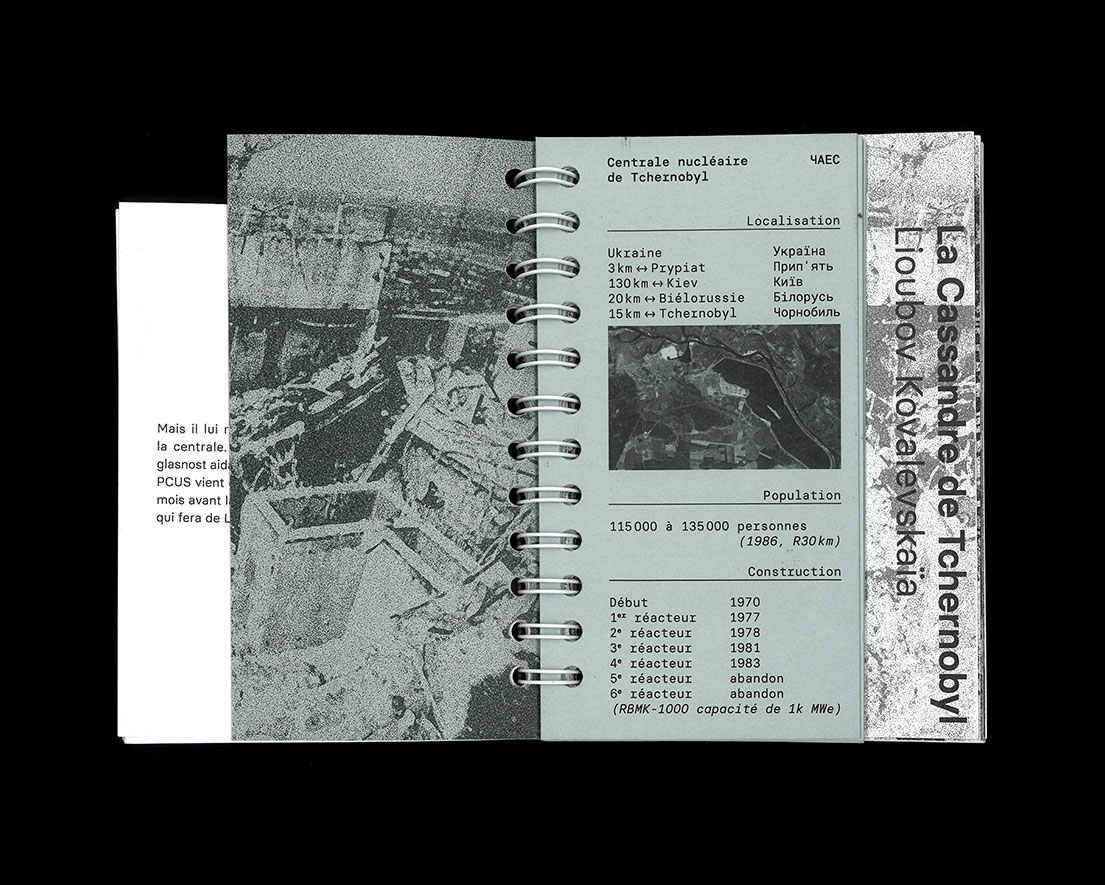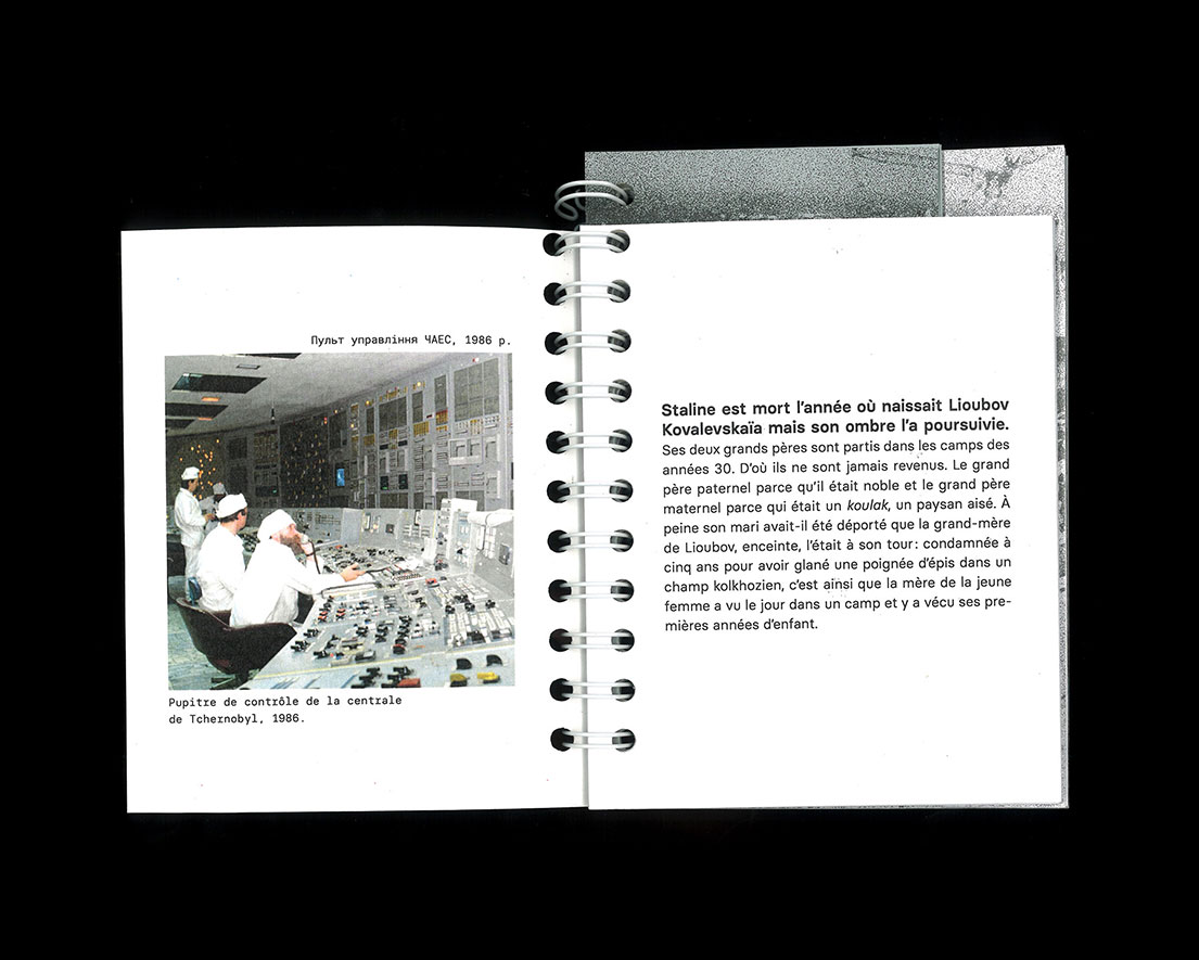 Editorial design retracing the Chernobyl disaster from the point of view of Lyubov Kovaleskaya, a Ukrainian journalist who tried to warn the USSR of the risk of accident, and showing how it deeply impacted her personal life.
